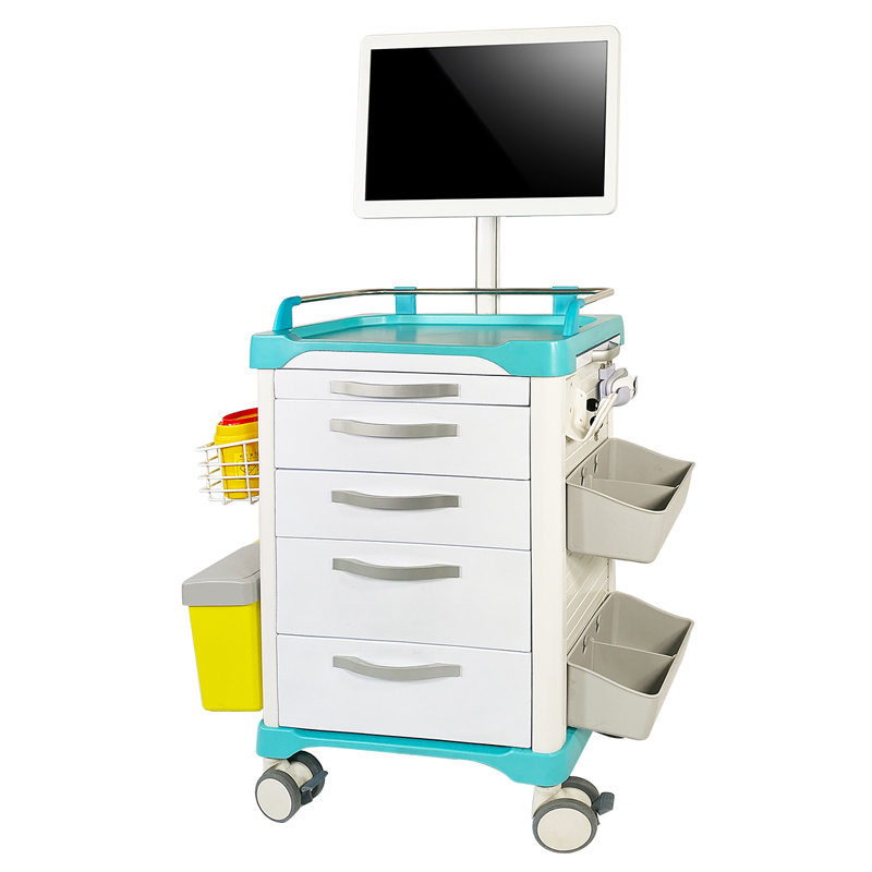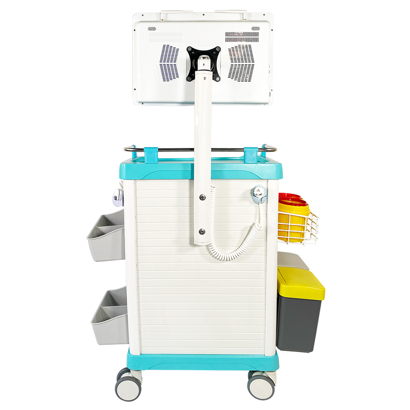 10.车体左侧上方悬挂浸塑网篮,可放置洗手液桶、锐器桶;下方配备垃圾桶,可轻松摘离;