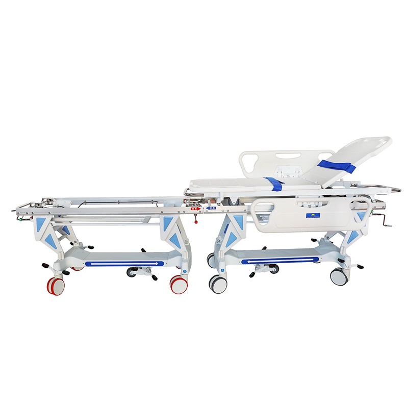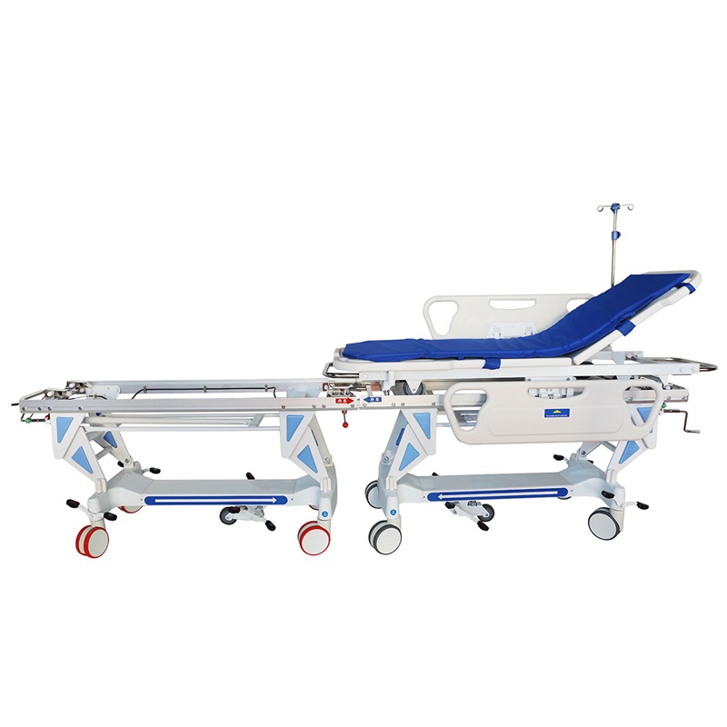 8.对接车轨道采用高强度铝合金型材,对接运动中更稳定可靠。背部气弹簧升降控制手柄、对接口、车体扶手、担架推行扶手等采用SUS304不锈钢原材料加工后并进行电镀工艺处理,对接口有双重固定保险装置;