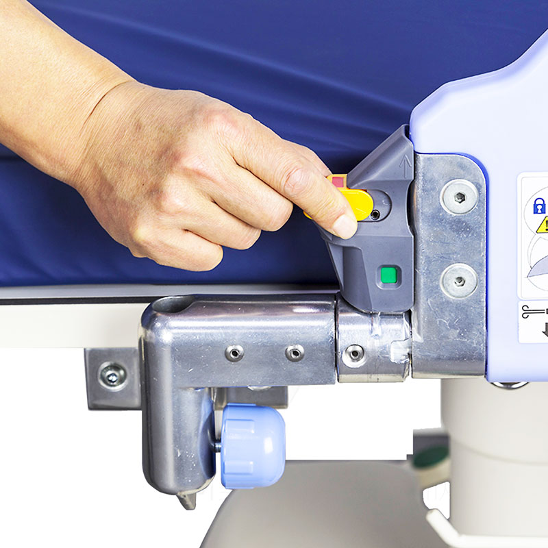 6.PP树脂成型两侧护栏板,高度300mm,患者更安全,也可以水平固定,增加床体宽度,让输液者的手臂有舒适的放置处,还可将病人与病床双向平移;并具有双安全锁进行锁定,防止误操作,提高了操作的安全性;