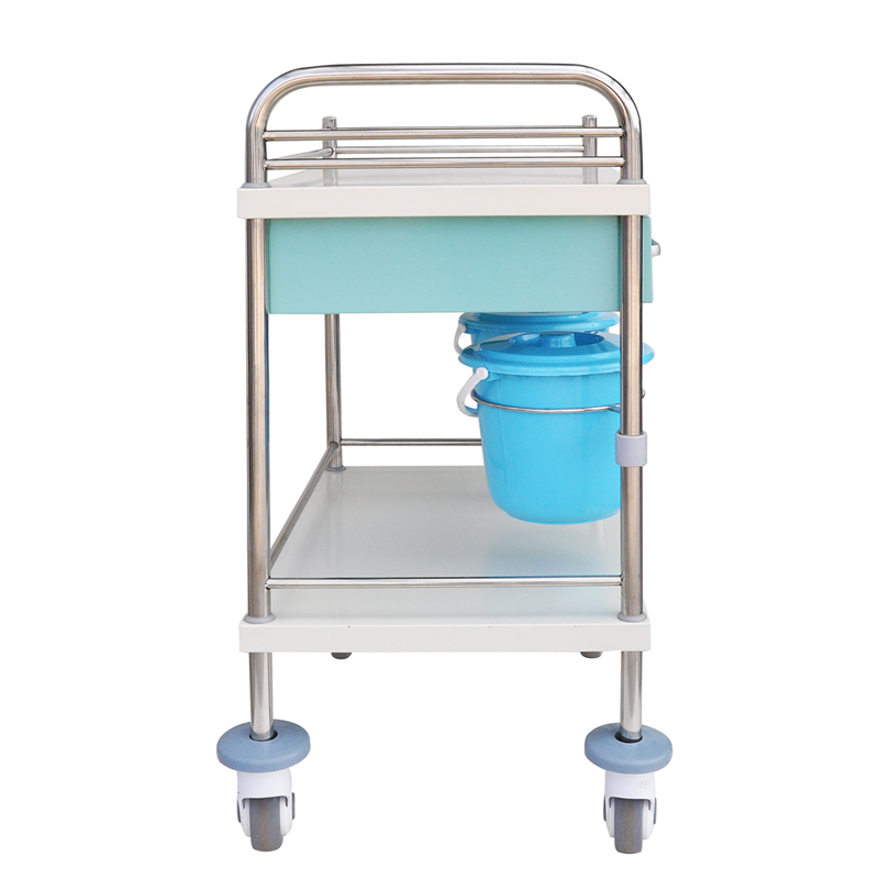 5.本车正面有两个抽屉,两层台面中间配有圆形带盖污物桶,便于分类医疗垃圾;